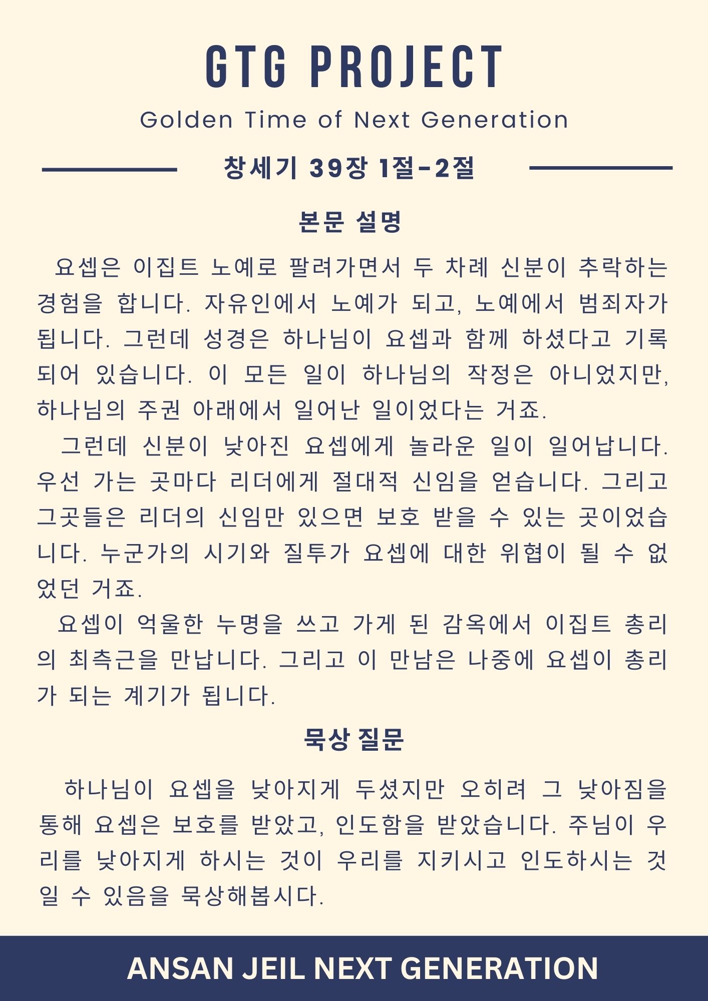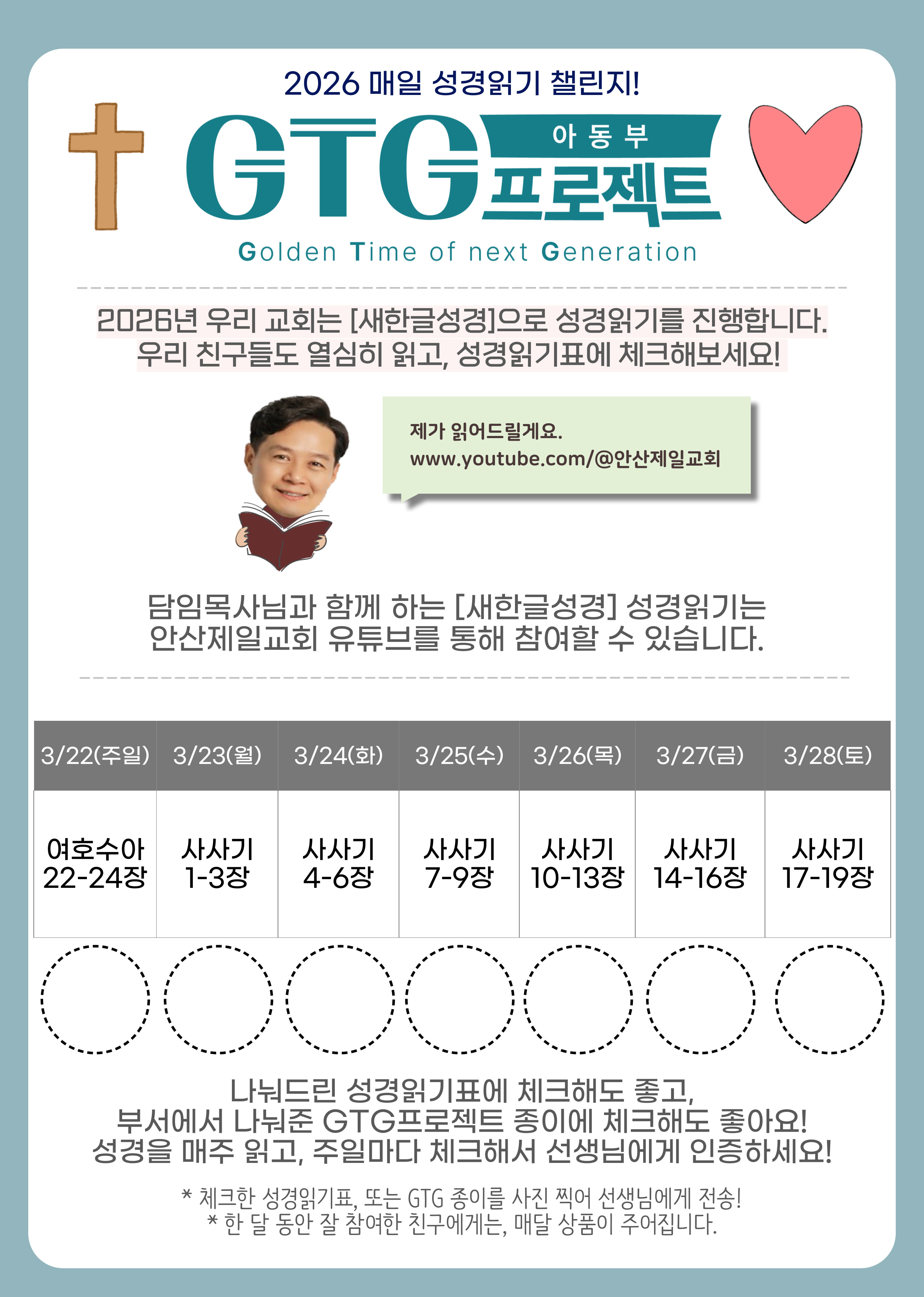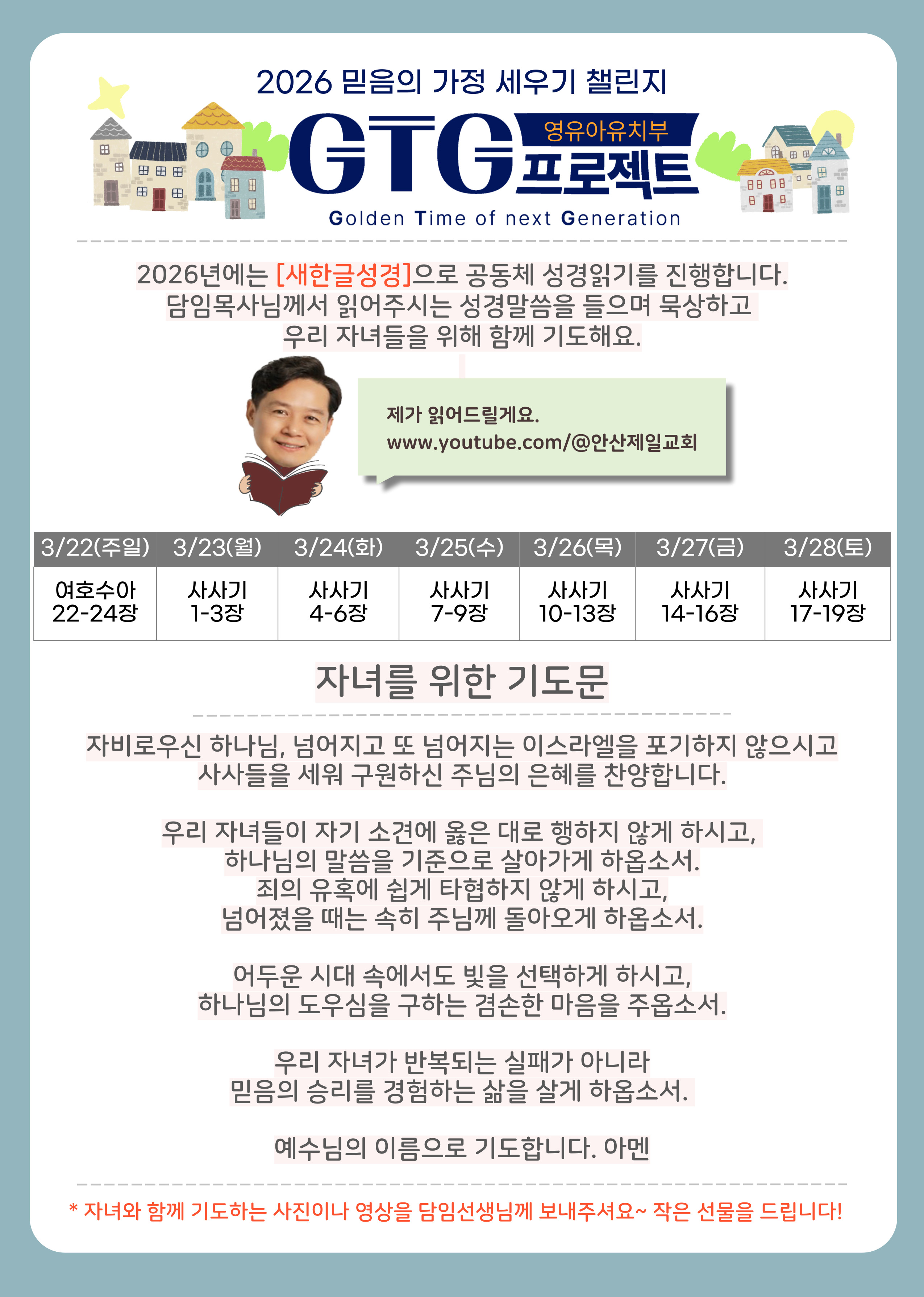 GTG 프로젝트는 가정에서의 신앙연계가 목적입니다. 온 세대가 교안을 통해 말씀을 읽고, 듣고, 암송하며 함께 신앙의 성장을 도모할 수 있도록 돕겠습니다.
