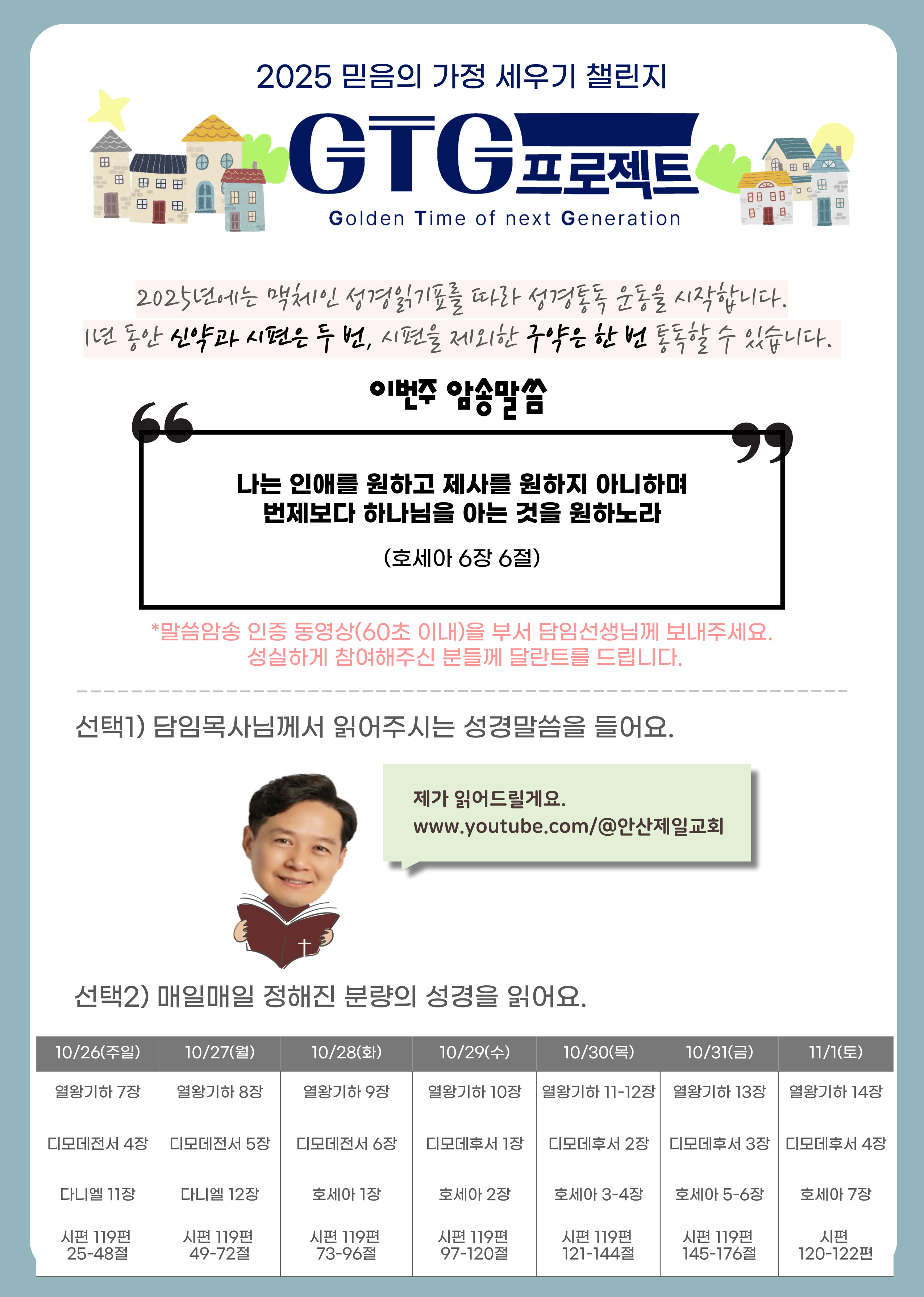 GTG 프로젝트는 가정에서의 신앙연계가 목적입니다. 온 세대가 교안을 통해 말씀을 읽고, 듣고, 암송하며 함께 신앙의 성장을 도모할 수 있도록 돕겠습니다.<