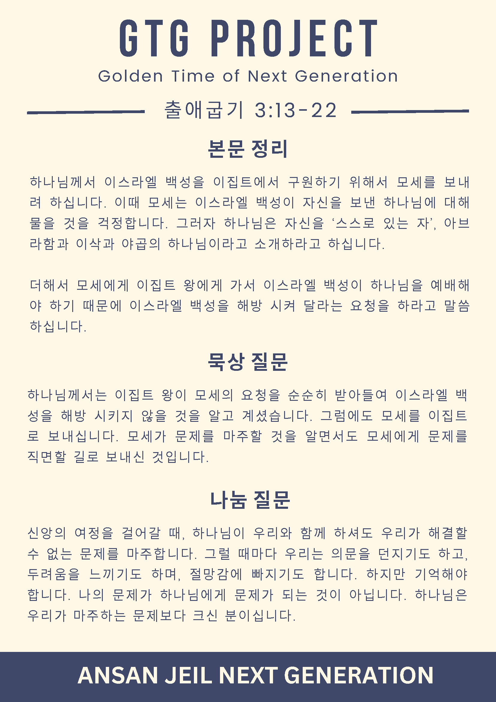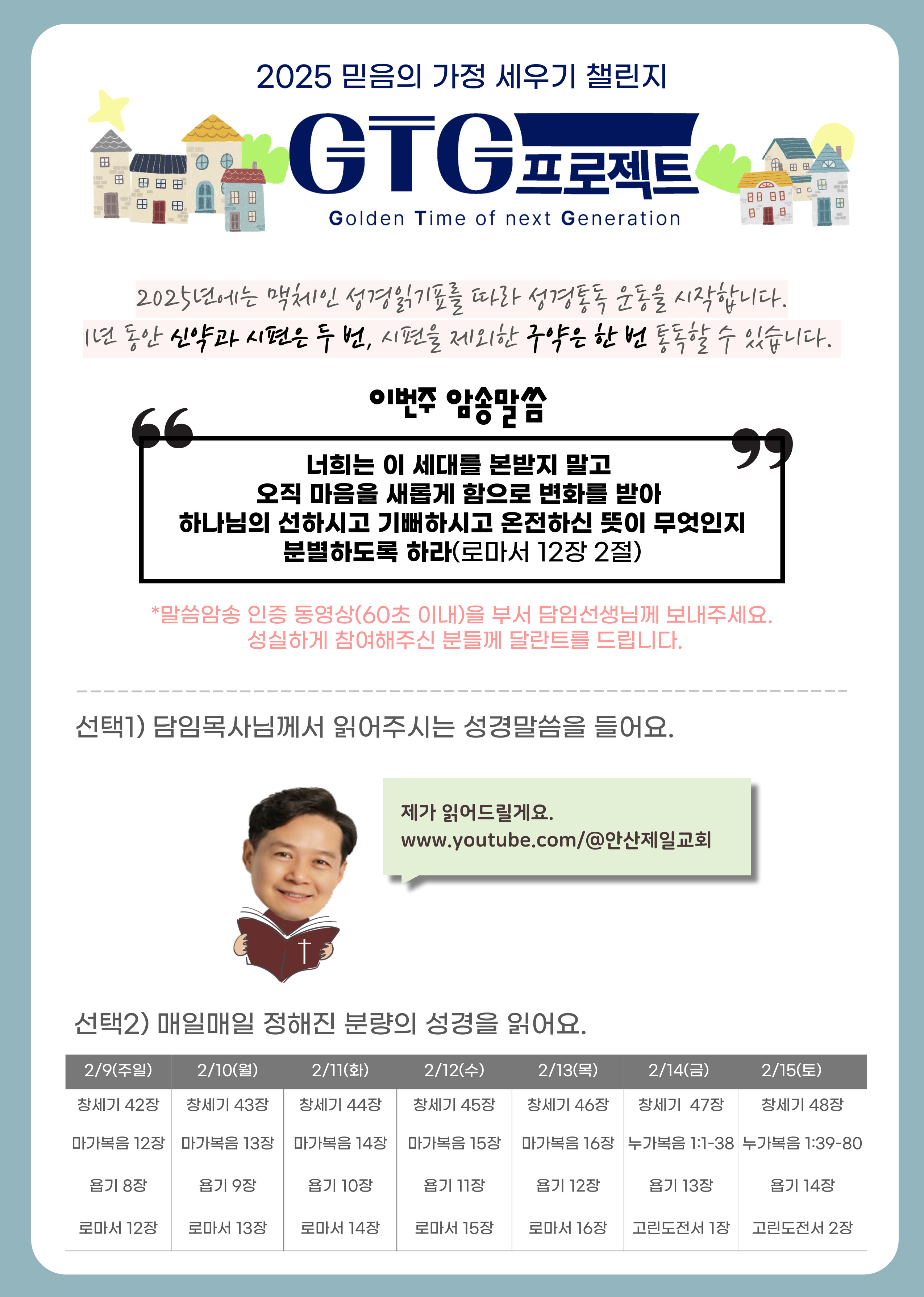 GTG 프로젝트는 가정에서의 신앙연계가 목적입니다. 온 세대가 교안을 통해 말씀을 읽고, 듣고, 암송하며 함께 신앙의 성장을 도모할 수 있도록 돕겠습니다.