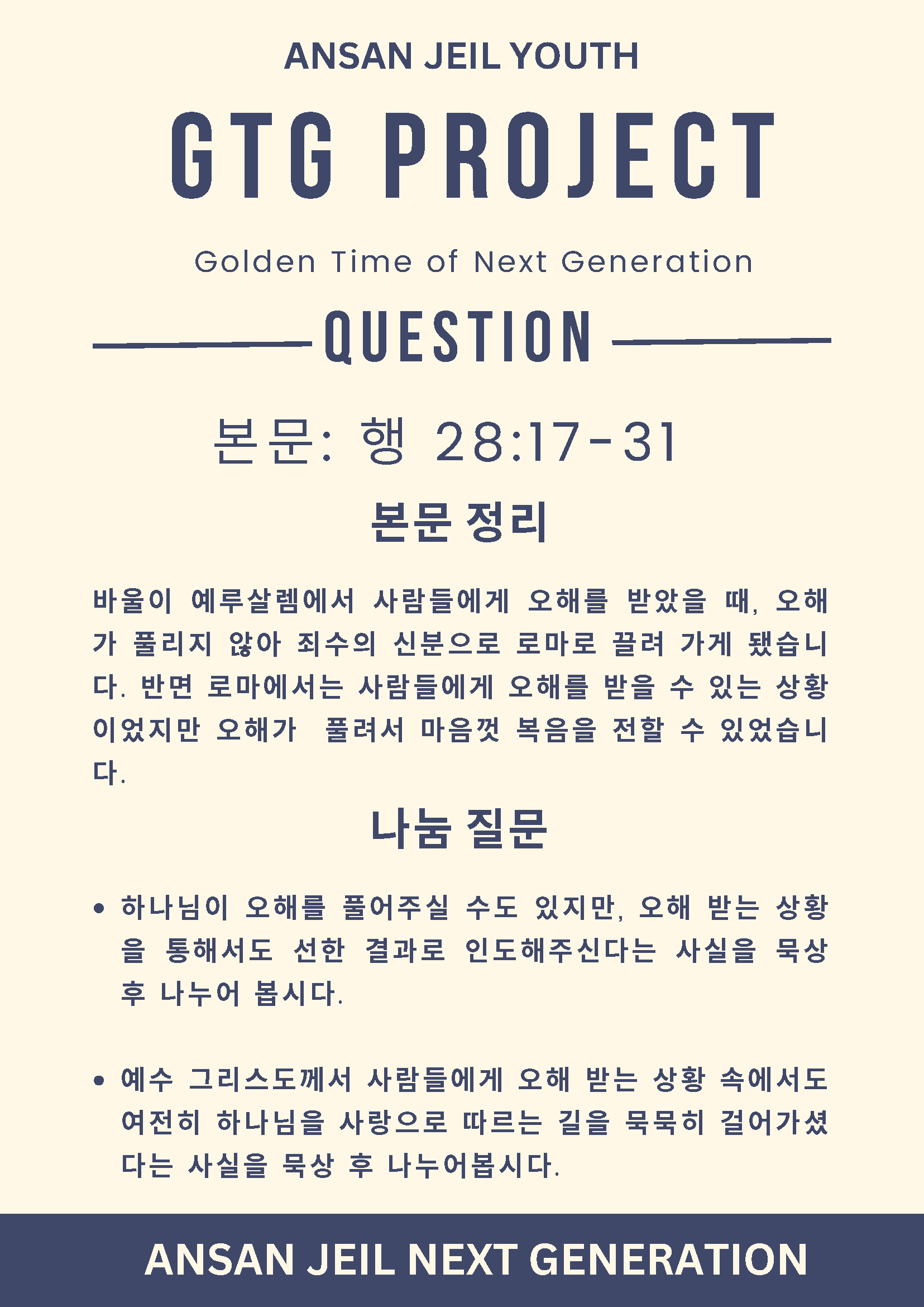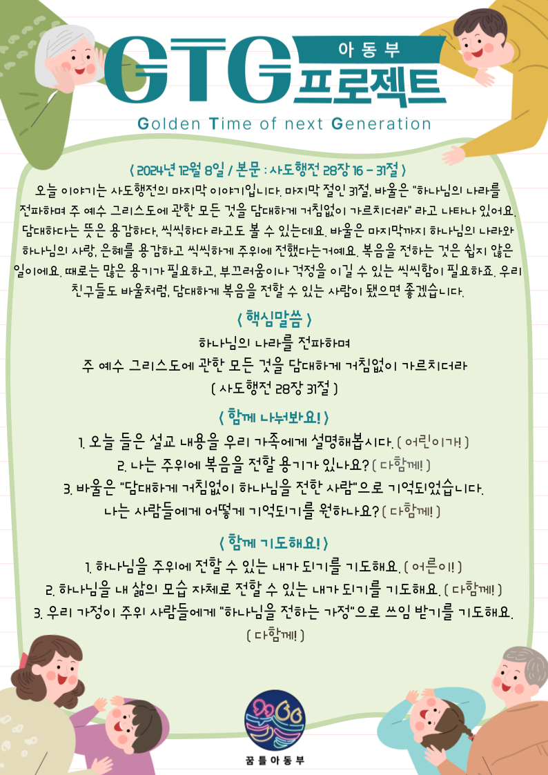 GTG 프로젝트는 온세대가 한 말씀을 보고, 듣고, 읽으며 함께 신앙이 성장해나가는 것을 지향합니다. 각 연령별 수준에 맞는 교안을 통해 신앙이 성장할 수 있도록 돕겠습니다.