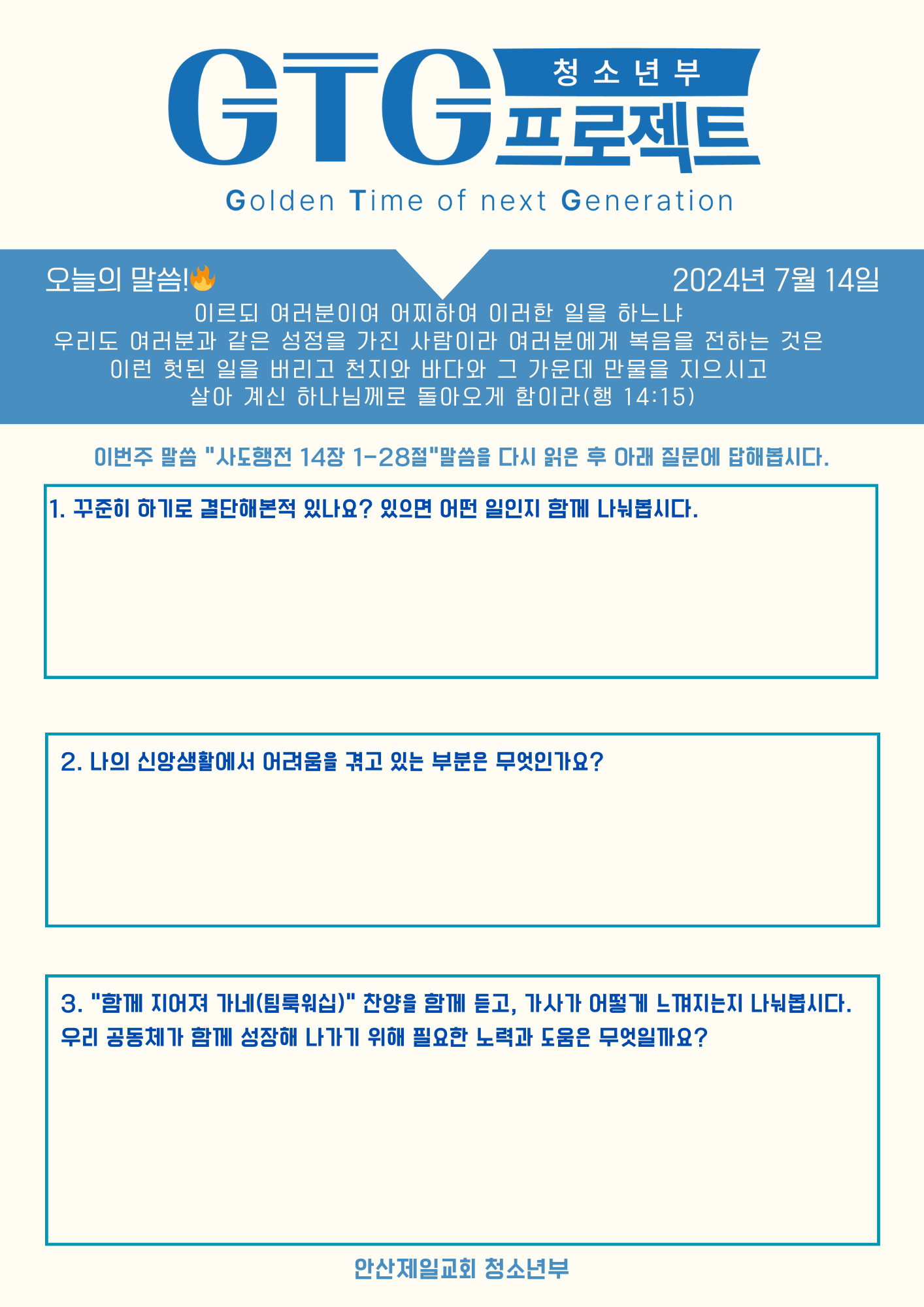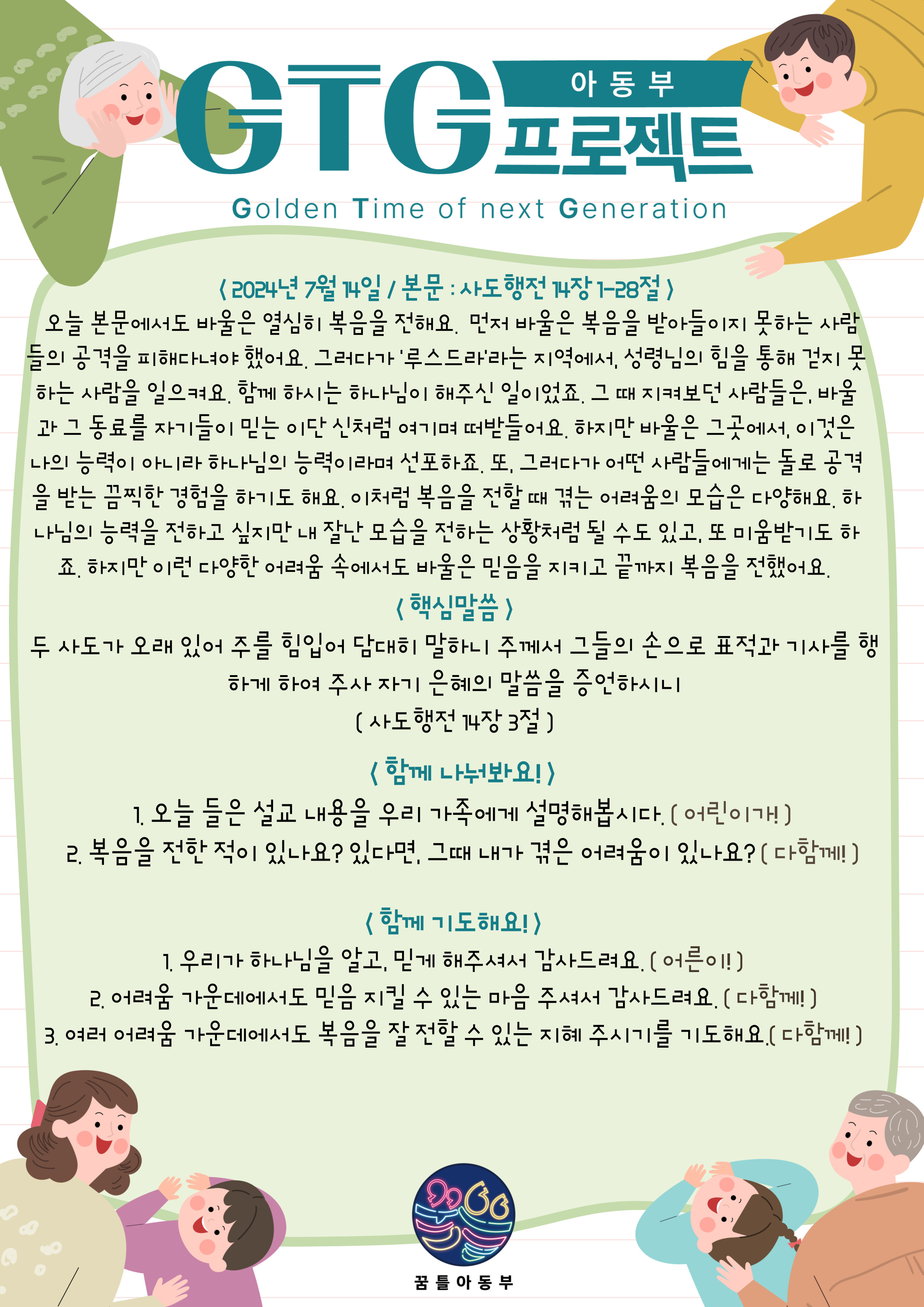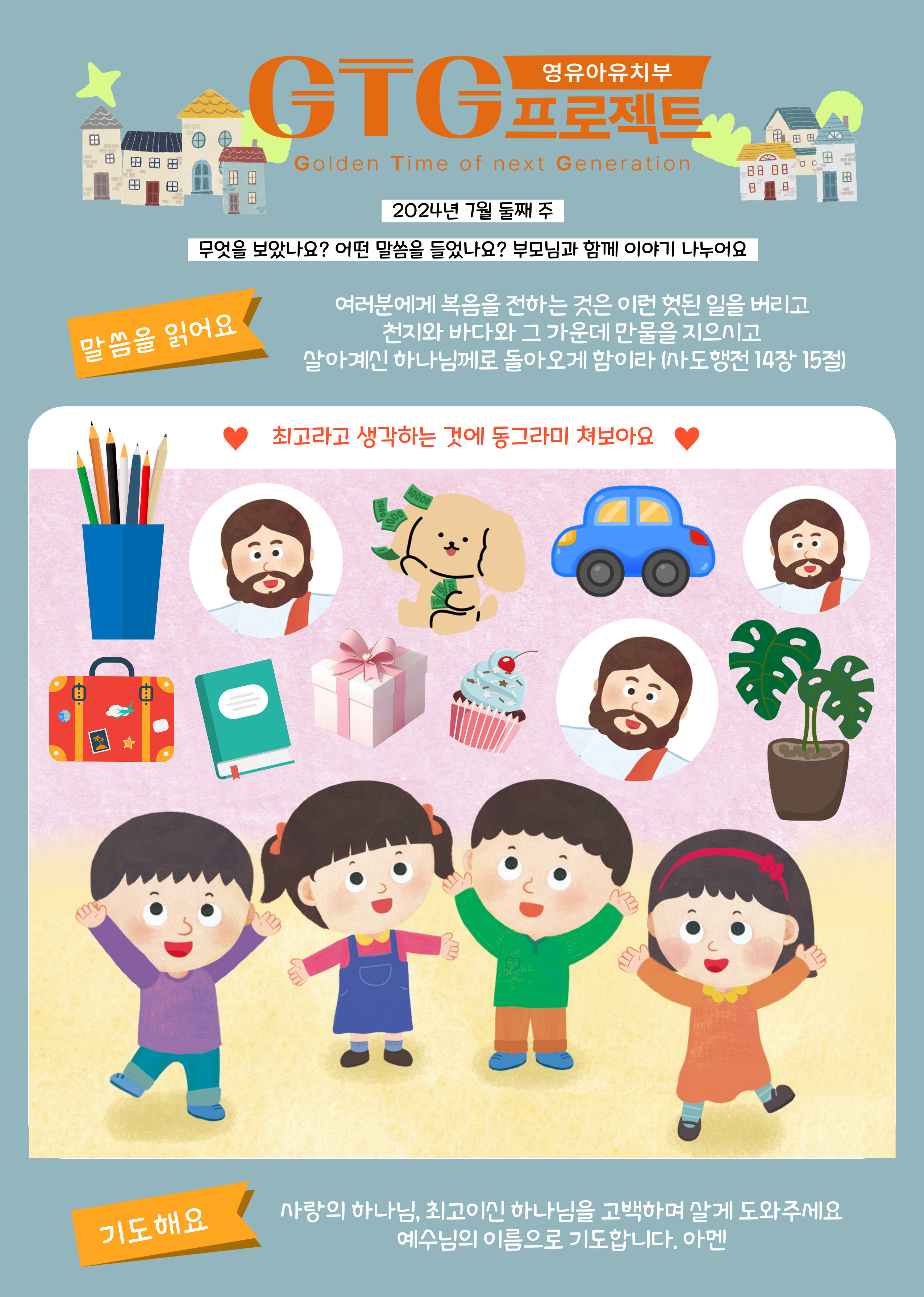 GTG 프로젝트는 온세대가 한 말씀을 보고, 듣고, 읽으며 함께 신앙이 성장해나가는 것을 지향합니다. 각 연령별 수준에 맞는 교안을 통해 신앙이 성장할 수 있도록 돕겠습니다.