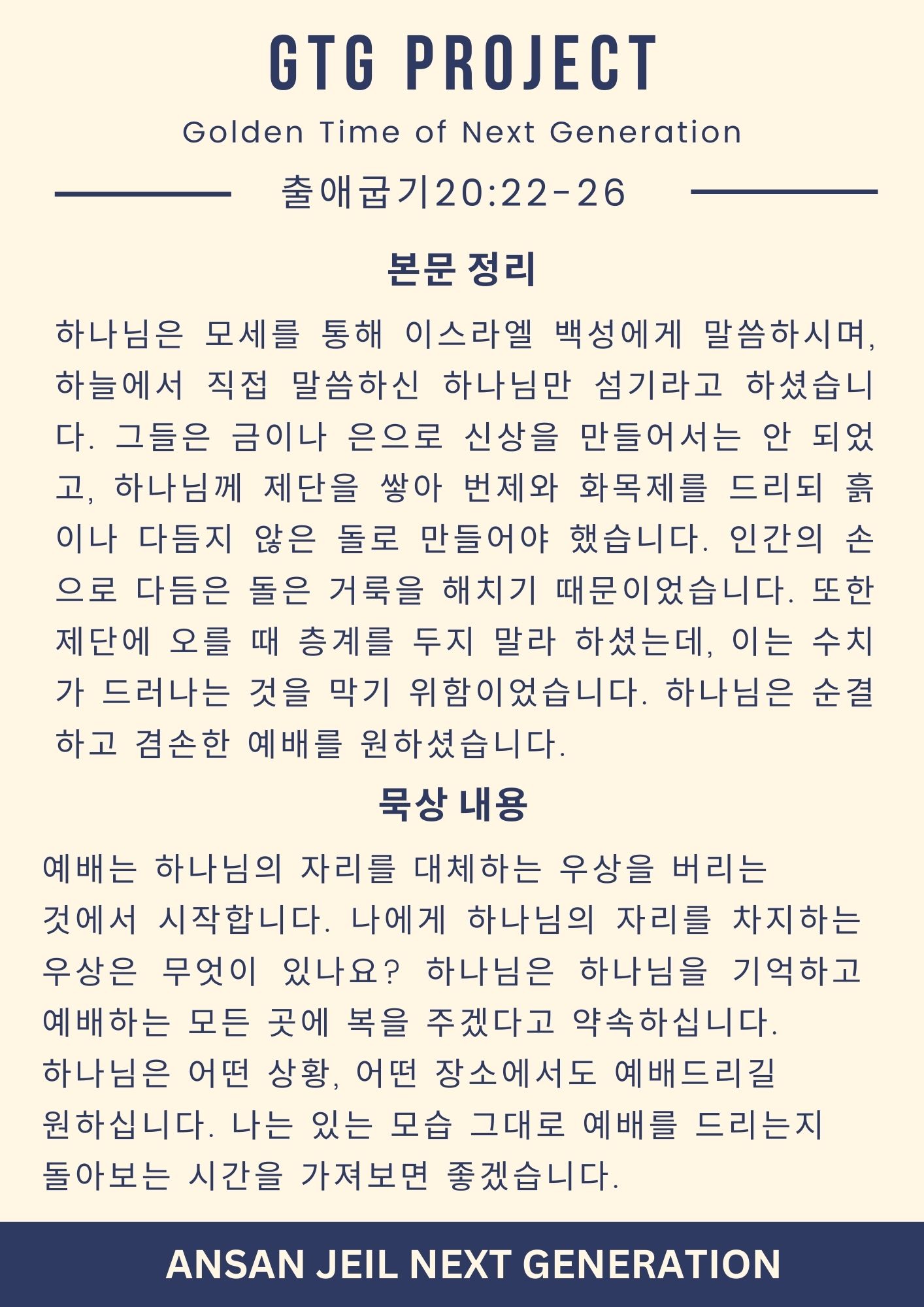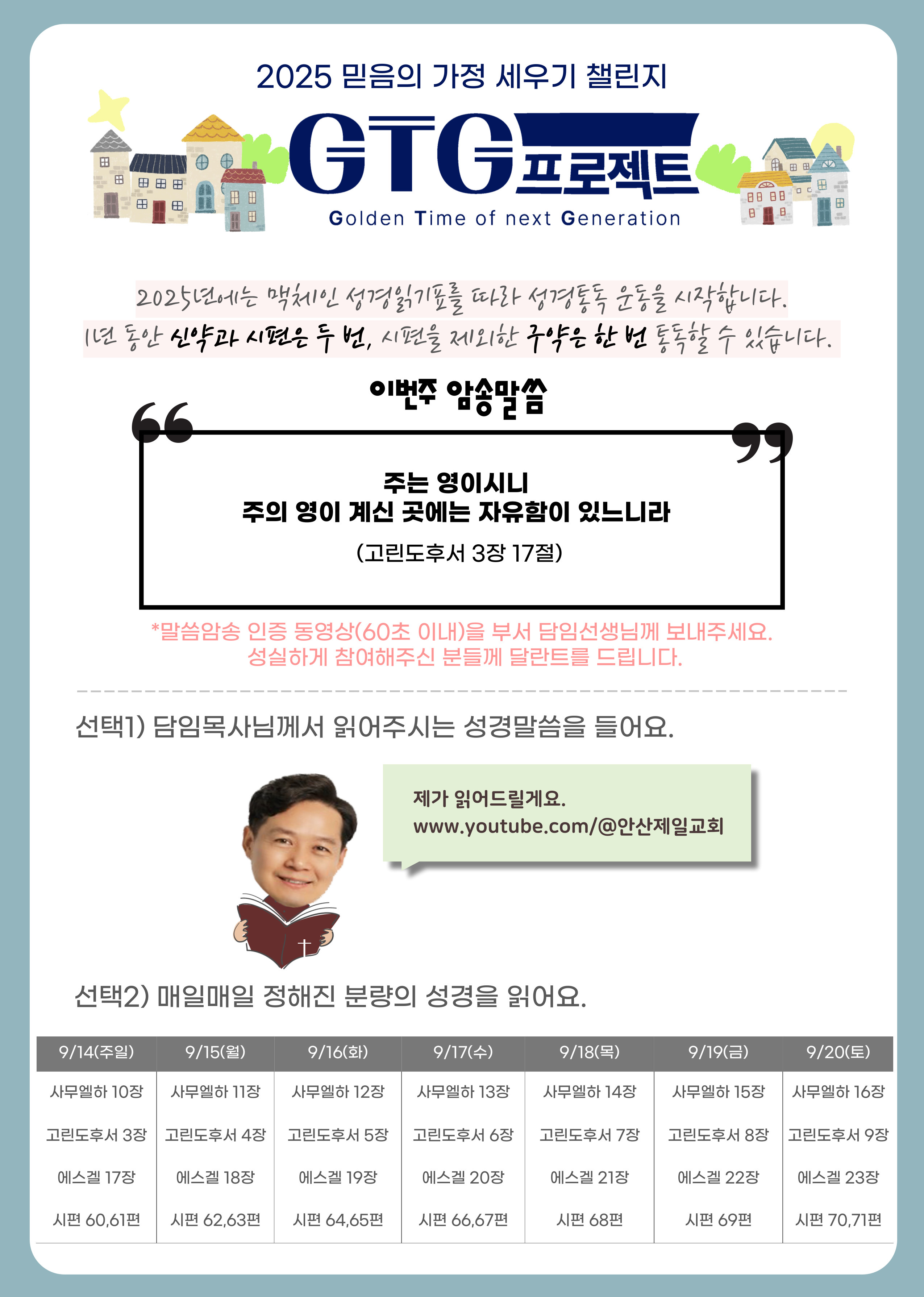 GTG 프로젝트는 가정에서의 신앙연계가 목적입니다. 온 세대가 교안을 통해 말씀을 읽고, 듣고, 암송하며 함께 신앙의 성장을 도모할 수 있도록 돕겠습니다.