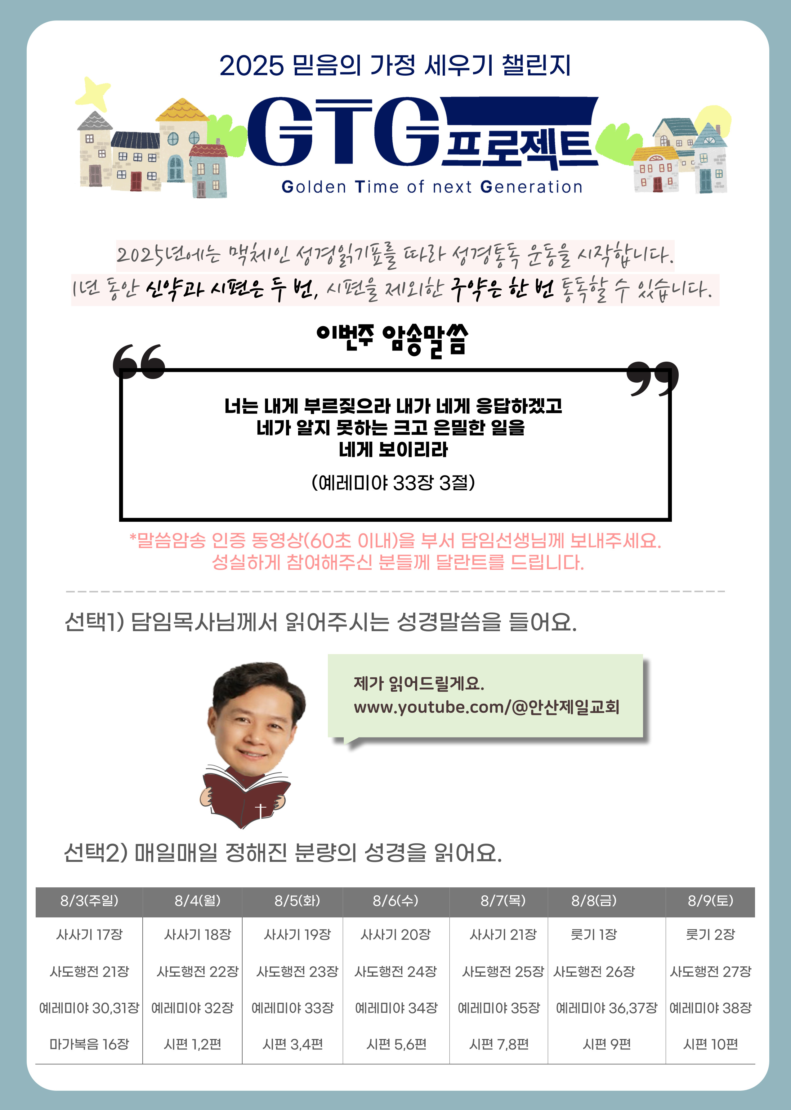 GTG 프로젝트는 온세대가 한 말씀을 보고, 듣고, 읽으며 함께 신앙이 성장해나가는 것을 지향합니다. 각 연령별 수준에 맞는 교안을 통해 신앙이 성장할 수 있도록 돕겠습니다.