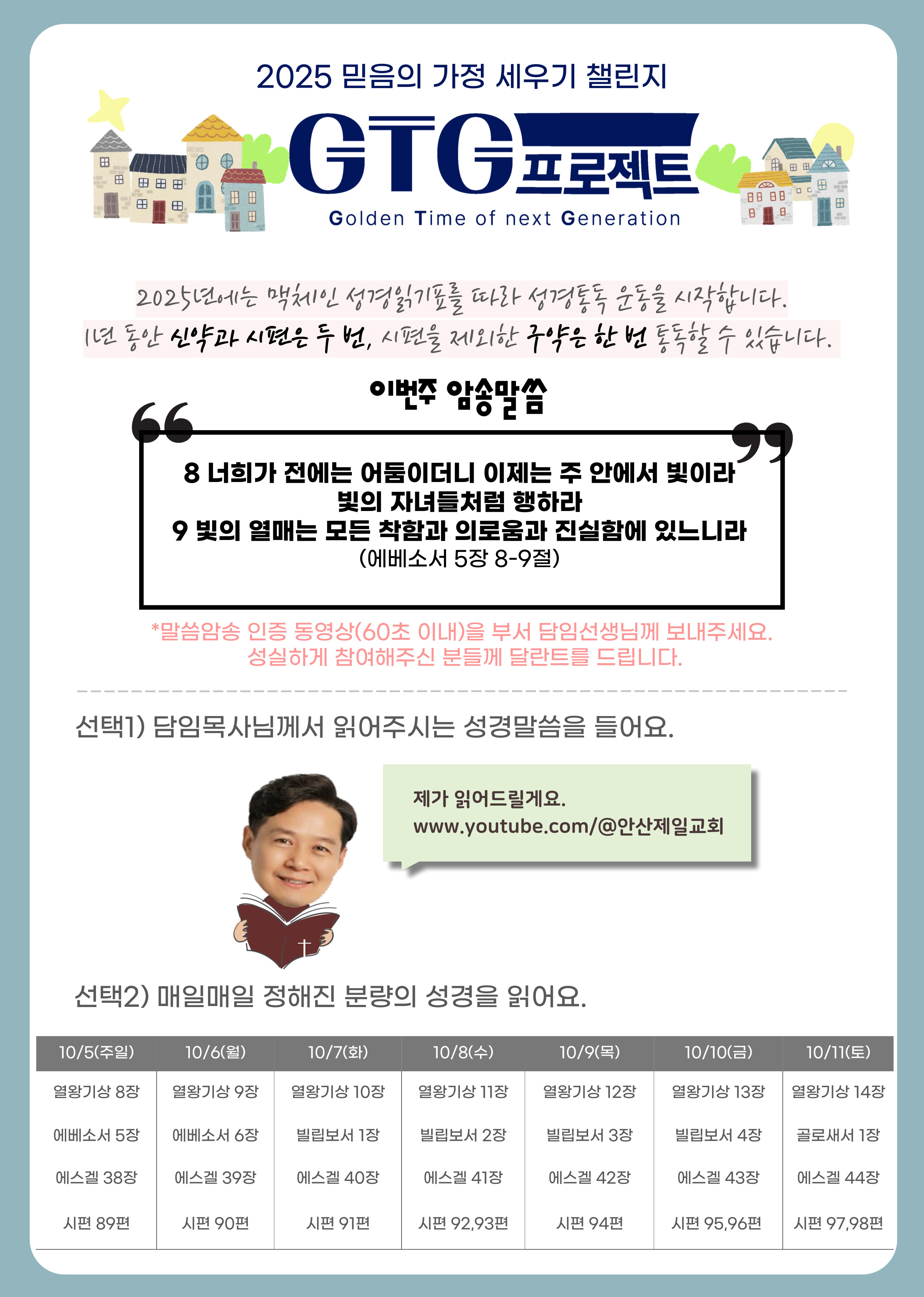 GTG 프로젝트는 가정에서의 신앙연계가 목적입니다. 온 세대가 교안을 통해 말씀을 읽고, 듣고, 암송하며 함께 신앙의 성장을 도모할 수 있도록 돕겠습니다.