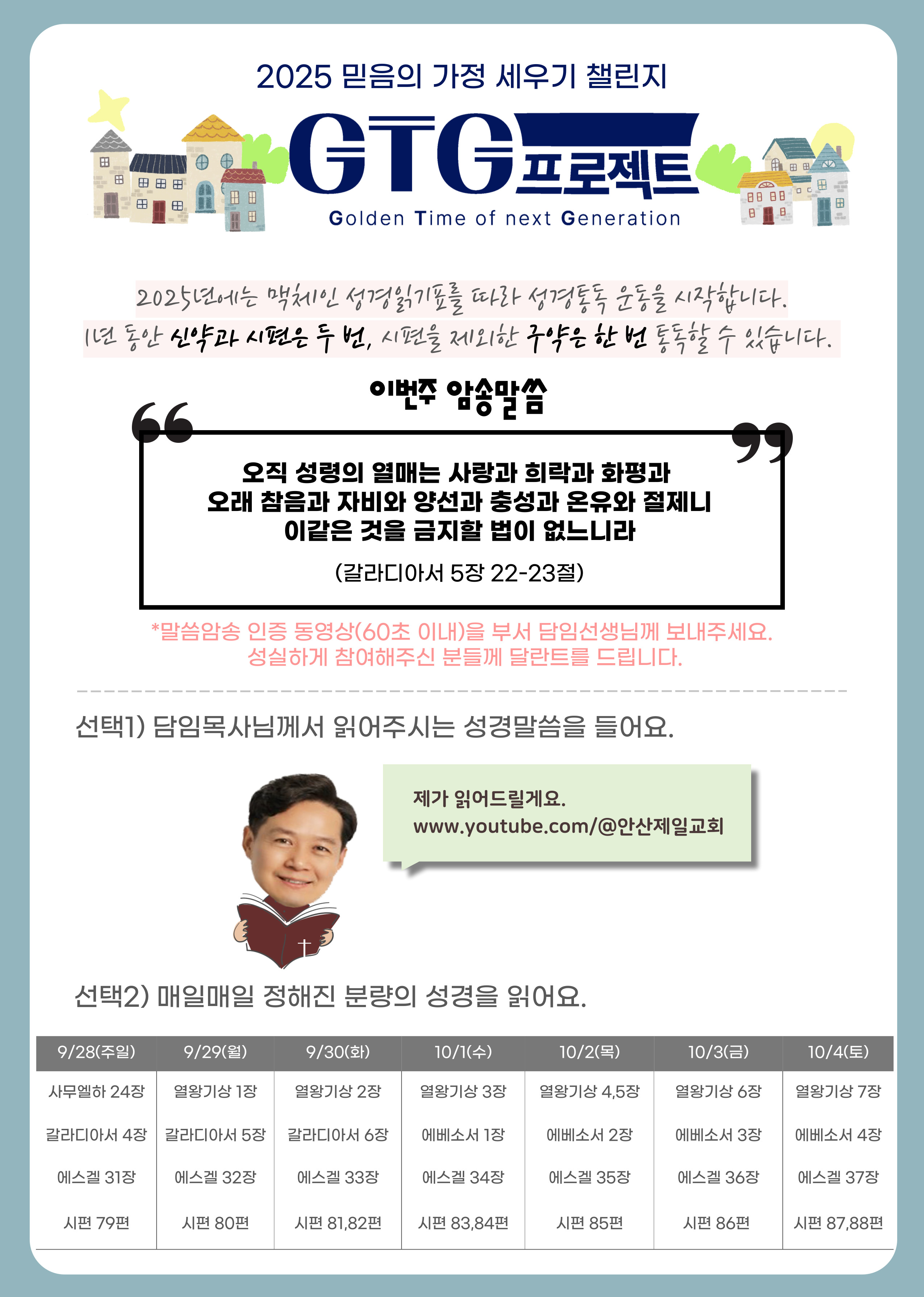 GTG 프로젝트는 가정에서의 신앙연계가 목적입니다. 온 세대가 교안을 통해 말씀을 읽고, 듣고, 암송하며 함께 신앙의 성장을 도모할 수 있도록 돕겠습니다.