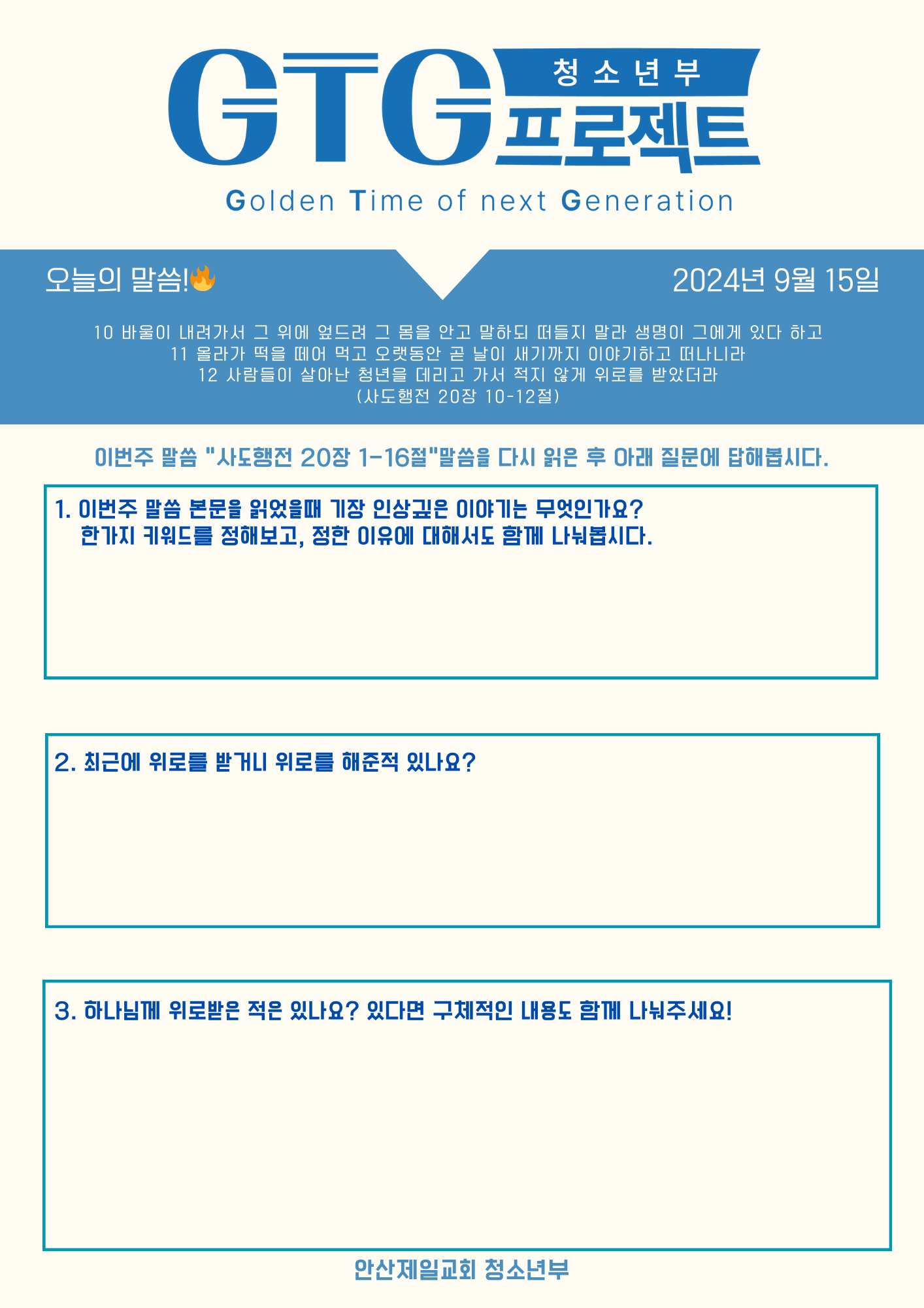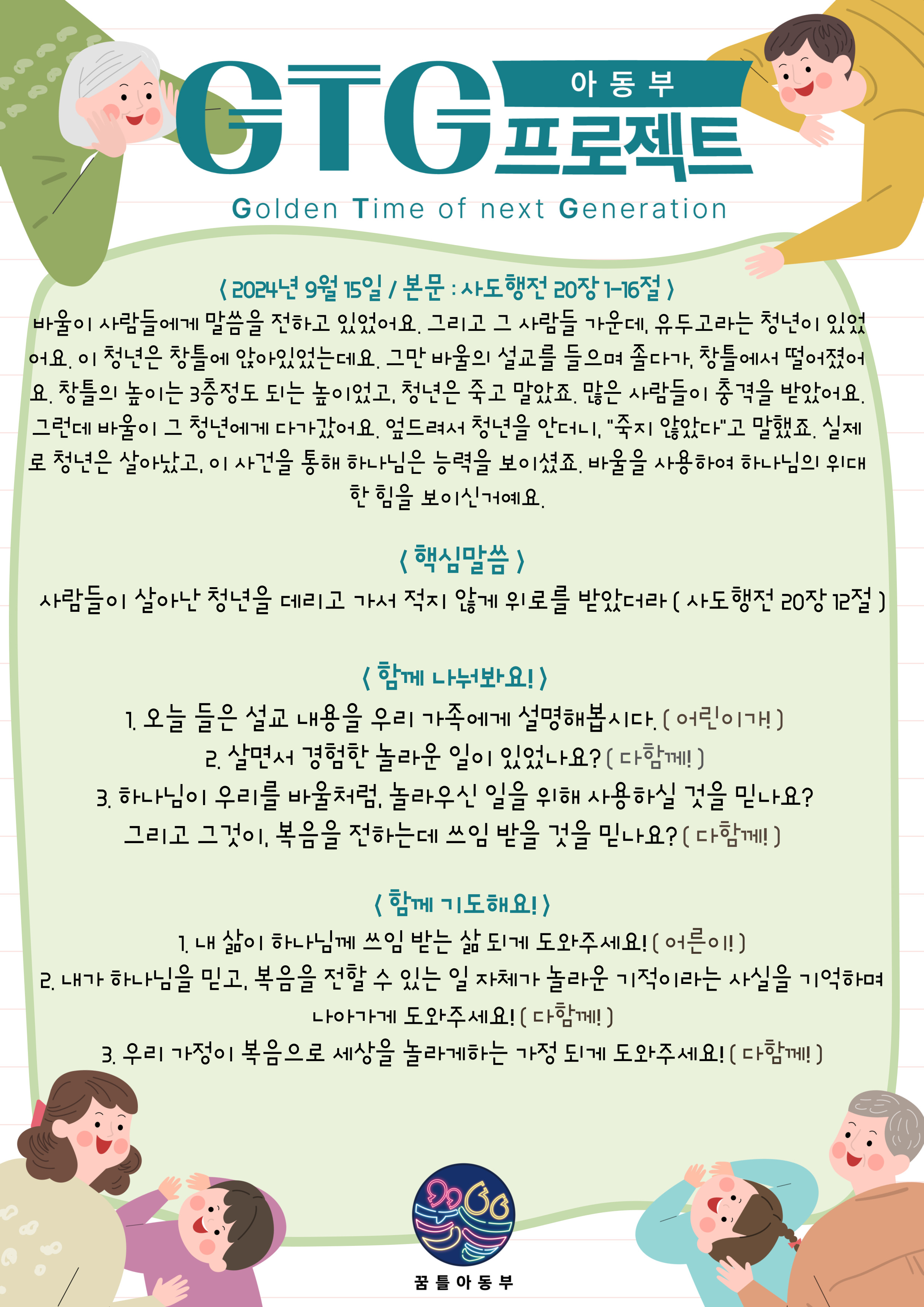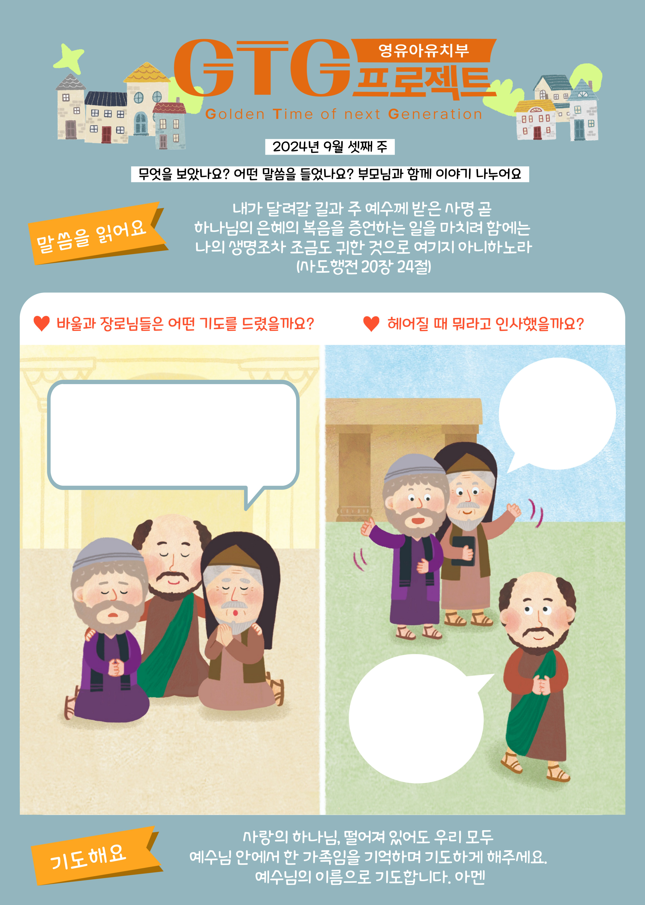 GTG 프로젝트는 온세대가 한 말씀을 보고, 듣고, 읽으며 함께 신앙이 성장해나가는 것을 지향합니다. 각 연령별 수준에 맞는 교안을 통해 신앙이 성장할 수 있도록 돕겠습니다.