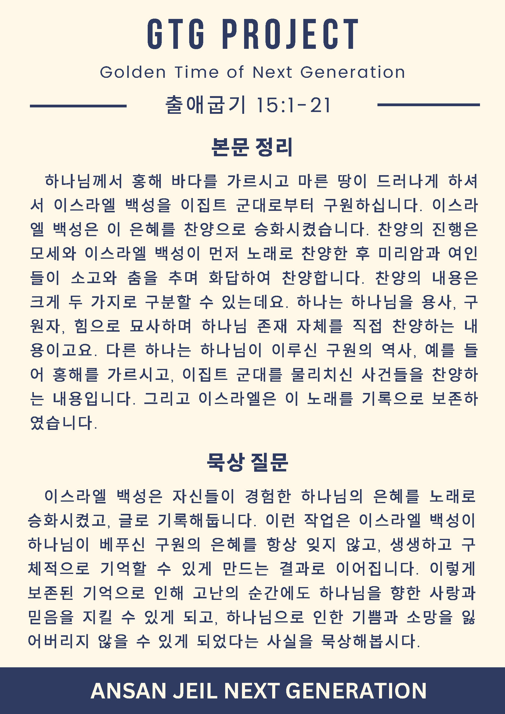 GTG 프로젝트는 가정에서의 신앙연계가 목적입니다. 온 세대가 교안을 통해 말씀을 읽고, 듣고, 암송하며 함께 신앙의 성장을 도모할 수 있도록 돕겠습니다.