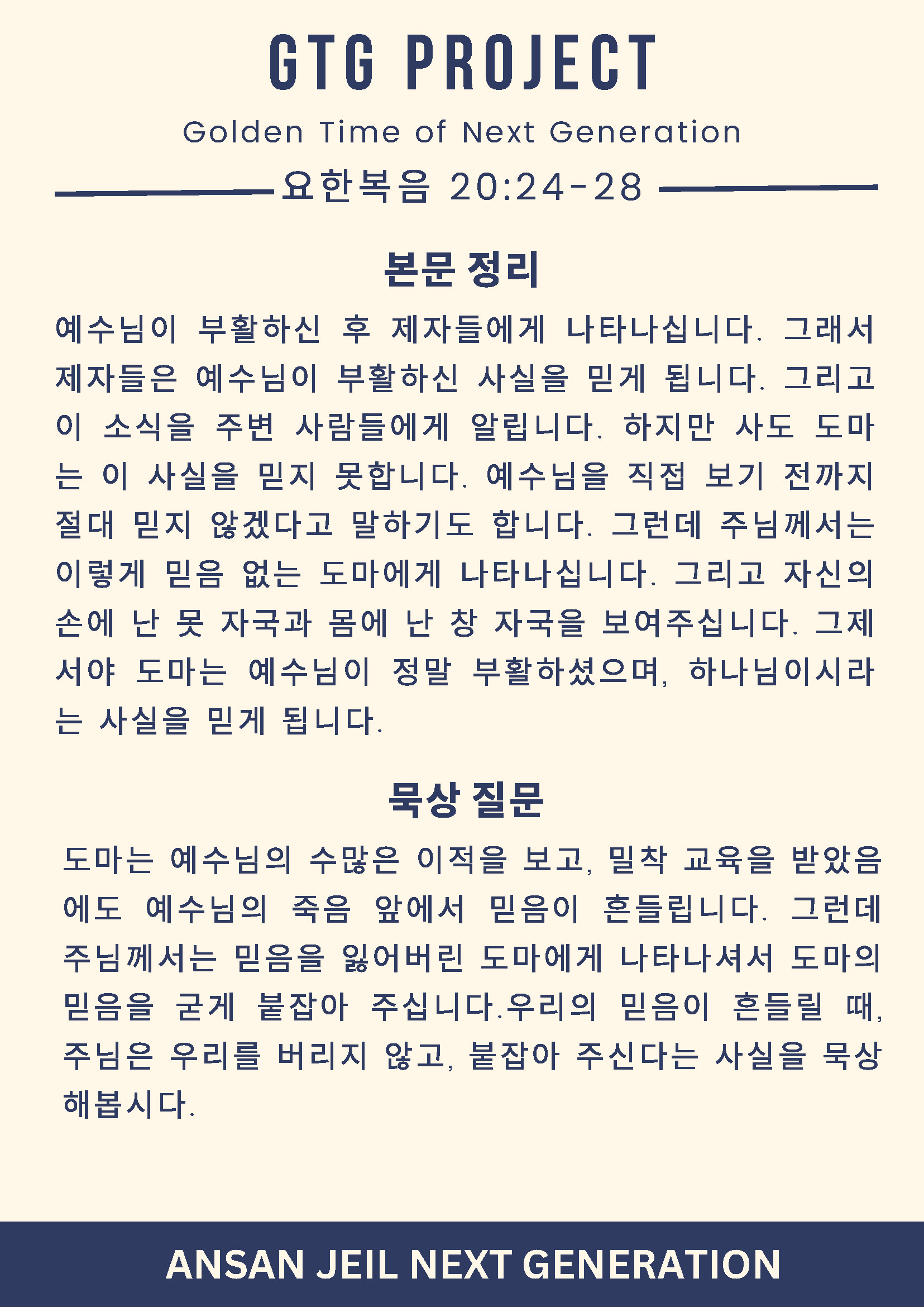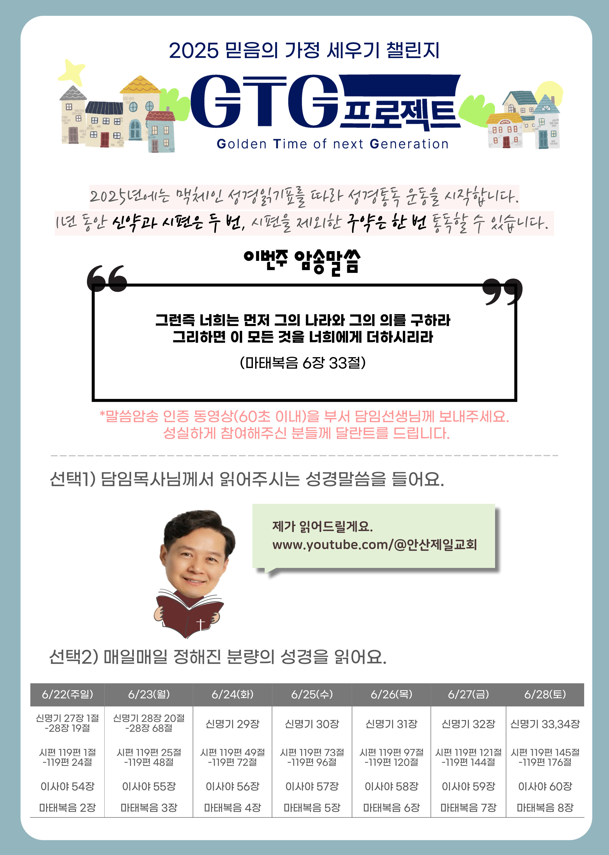 GTG 프로젝트는 가정에서의 신앙연계가 목적입니다. 온 세대가 교안을 통해 말씀을 읽고, 듣고, 암송하며 함께 신앙의 성장을 도모할 수 있도록 돕겠습니다.