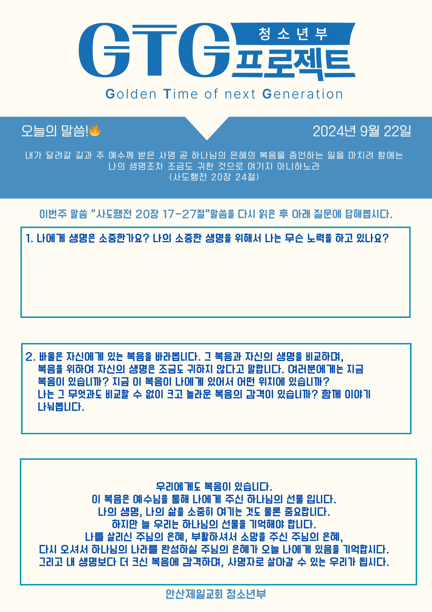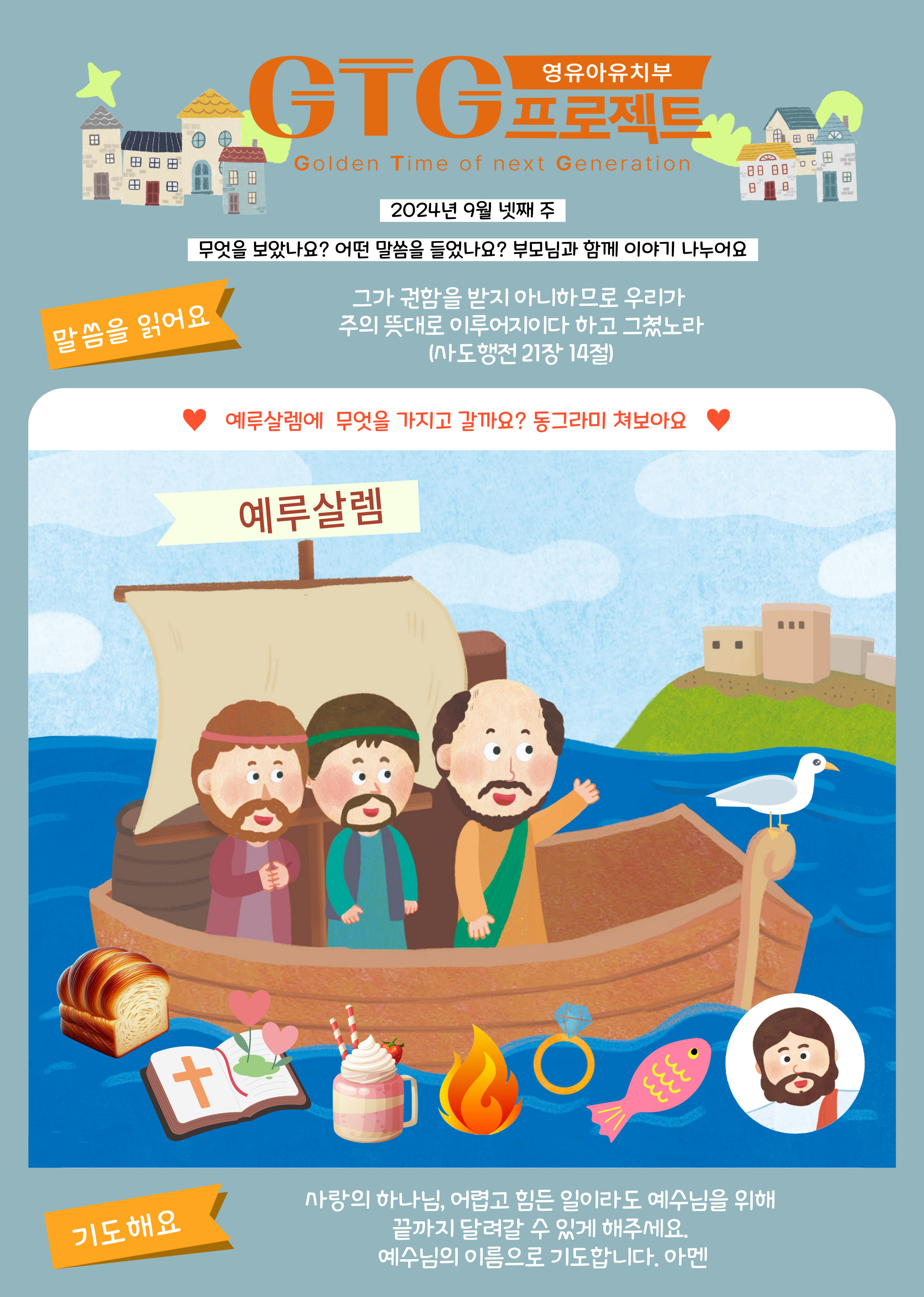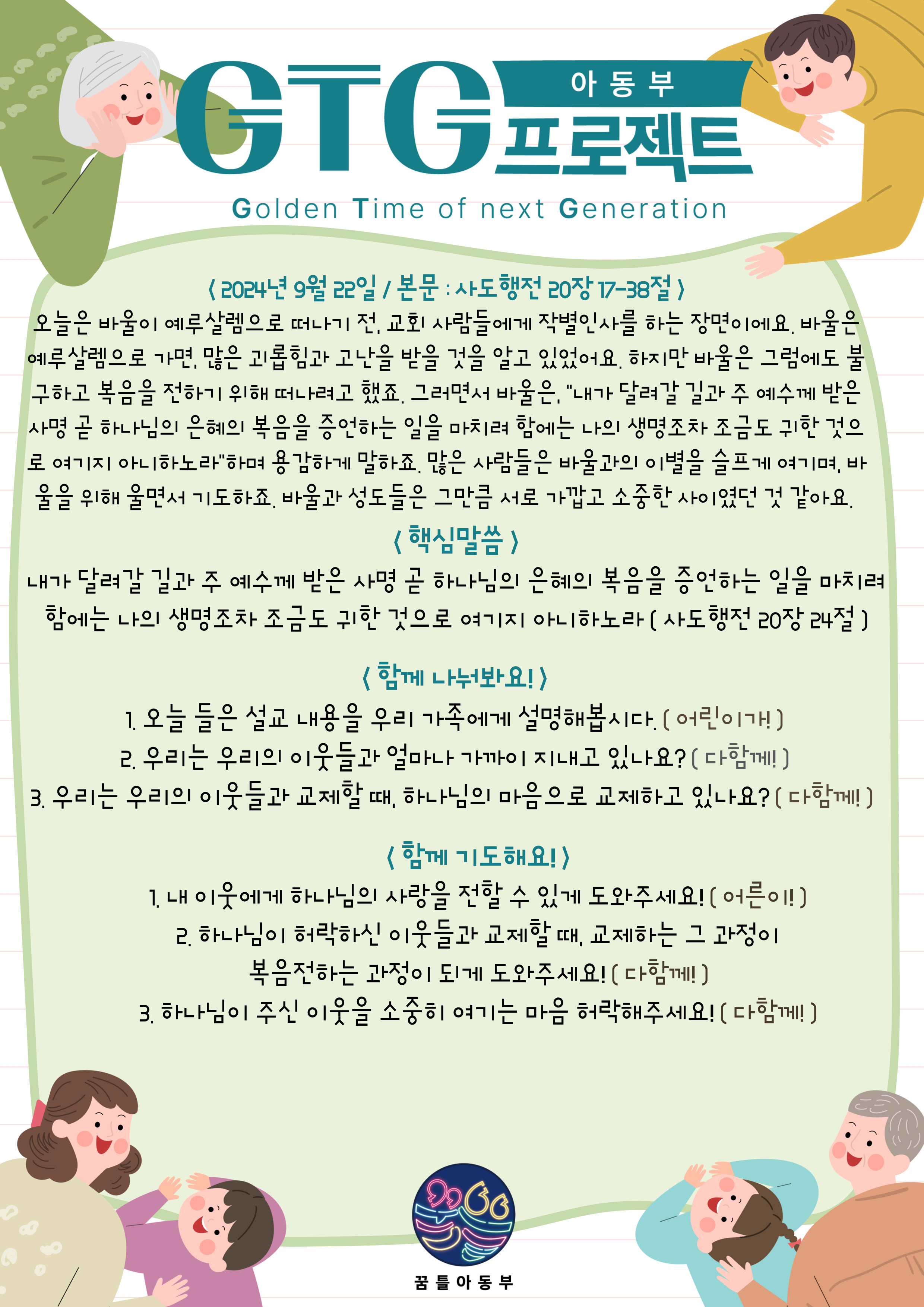 GTG 프로젝트는 온세대가 한 말씀을 보고, 듣고, 읽으며 함께 신앙이 성장해나가는 것을 지향합니다. 각 연령별 수준에 맞는 교안을 통해 신앙이 성장할 수 있도록 돕겠습니다.