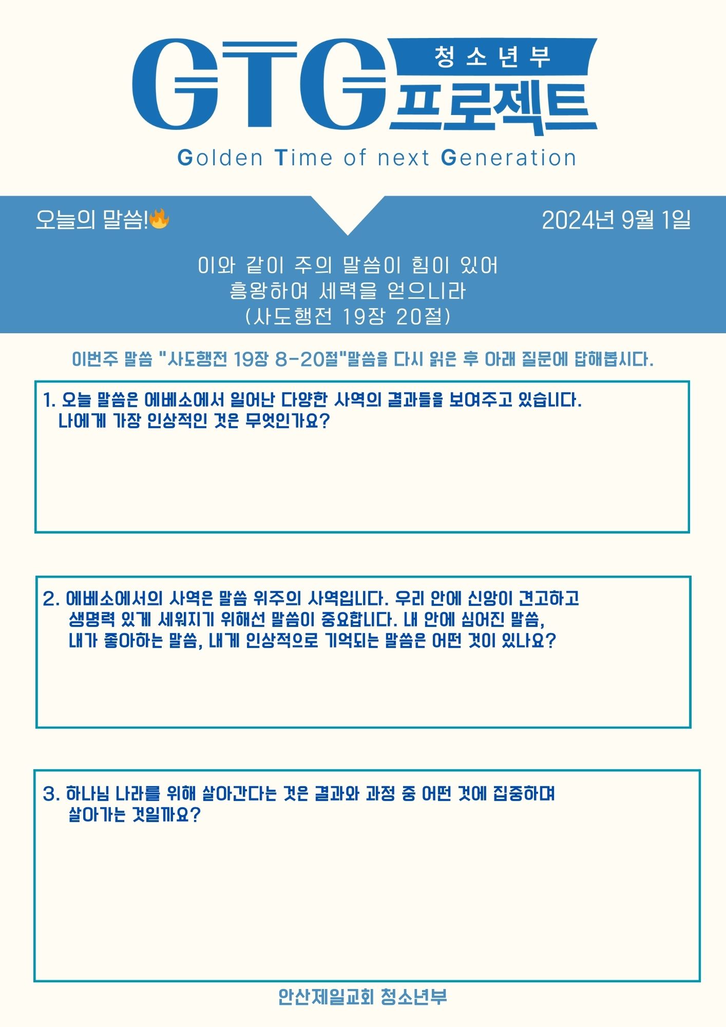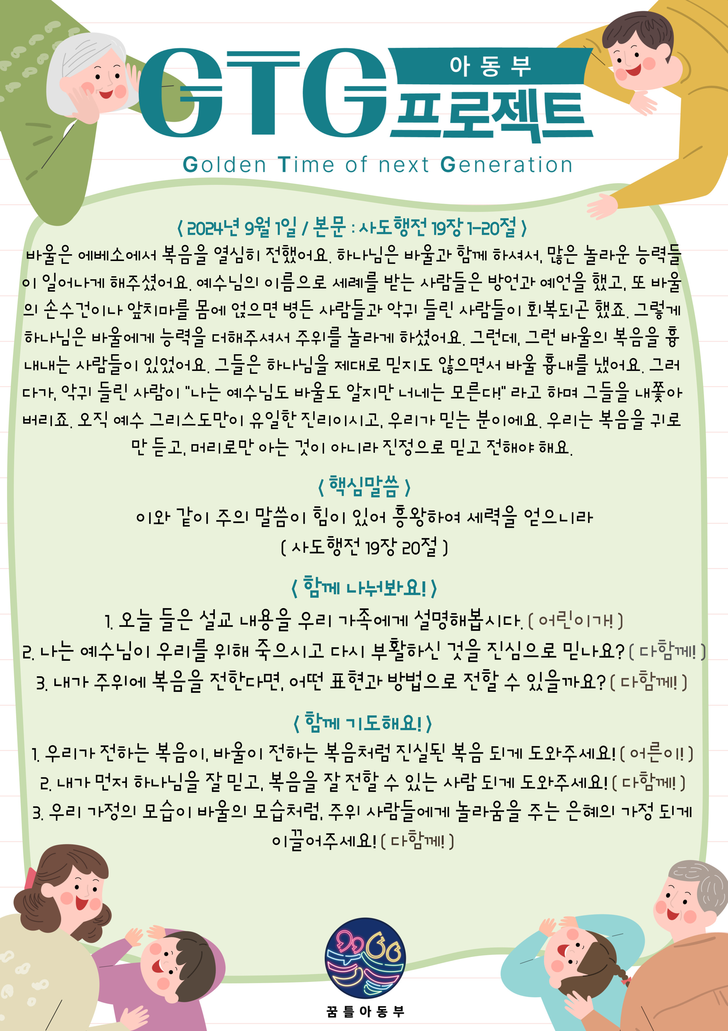 GTG 프로젝트는 온세대가 한 말씀을 보고, 듣고, 읽으며 함께 신앙이 성장해나가는 것을 지향합니다. 각 연령별 수준에 맞는 교안을 통해 신앙이 성장할 수 있도록 돕겠습니다.